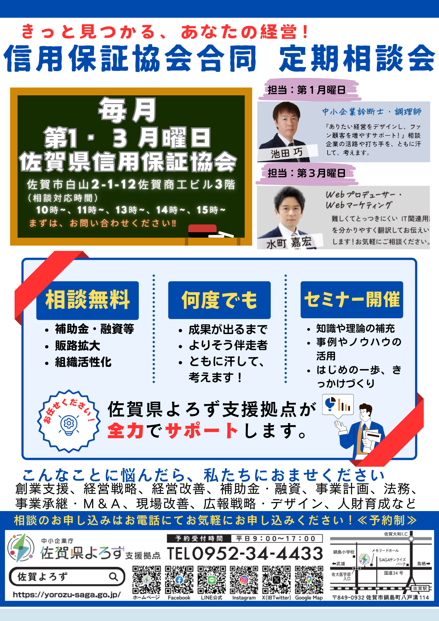 当協会と佐賀県よろず(創業、融資、経営改善)支援拠点の専門家との合同で、下記要領にて相談会を実施しております。事前予約が必要になりますが、参加は無料となっておりますので、どうぞご相談ください。
