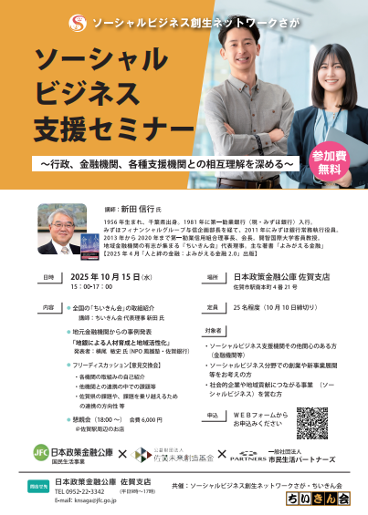 (共催:ソーシャルビジネス創生ネットワークさが(株式会社日本政策金融公庫国民生活事業、公益財団法人佐賀未来創造基金、一般社団法人市民生活パートナーズ)及び、ちいきん会)